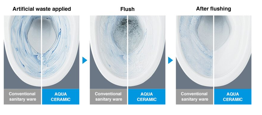 Công nghệ Aqua Ceramic đã tạo ra một loại men sứ vệ sinh có đặc tính siêu ưa nước. Nước có thể luồn vào giữa bề mặt sứ và vết bẩn, từ đó nâng bổng vết bẩn lên và dùng sức nước đánh bật vết bẩn ra khỏi bồn cầu 2 khối Inax nhanh chóng nhất.