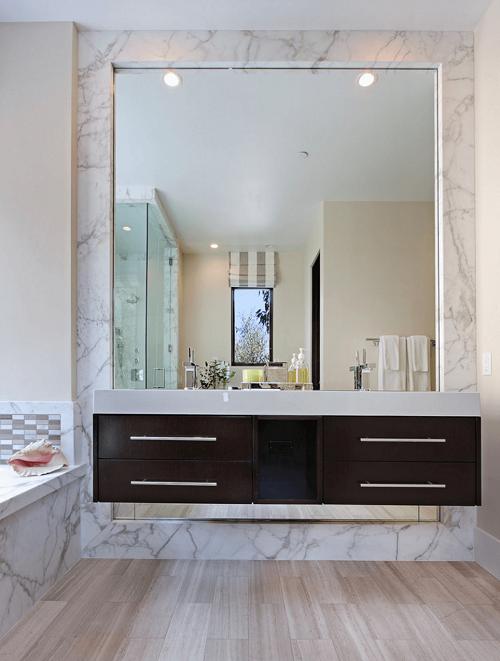 Bình thường gương được đặt rộng bằng phần bàn đá phía dưới, chiều rộng gương phòng tắm được quyết định bởi chiều cao và kích thước vị trí treo gương. Đa phần sẽ cắt gương có độ dài đủ để cách 2 mép vị trí treo gương khoảng 15cm.
