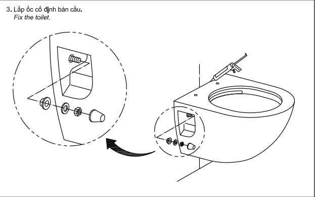 Trong quá trình thi công nhà vệ sinh, đơn vị thi công sẽ lắp sẵn các thanh giá đỡ để bạn đặt bệ xí. Lúc này bạn chỉ cần tháo nút che và gắn bệ xí vào vị trí đặt trước và khóa ốc.