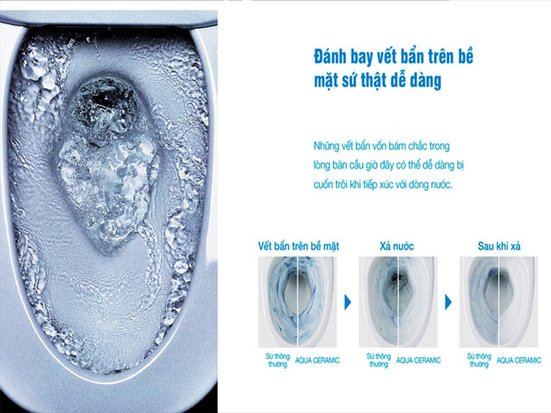 Như đã nêu trên, Aqua Ceramic có đặc tính ưa nước nên từ đó nước có thể luồn sâu vào giữa của bồn cầu và vết bẩn. Nhờ vậy mà các chất bẩn được cuốn trôi gần như hoàn toàn.