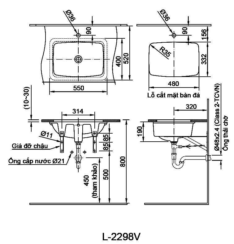 Bản vẽ kỹ thuật của chậu âm bàn Inax L-2298V