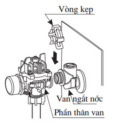 Lắp phần thân van vào van ngắt nước từ phía trước, sau đó cố định bằng vòng kẹp