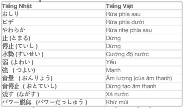 * LƯU Ý: Nếu bảng điều khiển của bet Inax nắp rửa điện tử là tiếng Nhật, người sử dụng có thể lưu ý những kí tự sau: