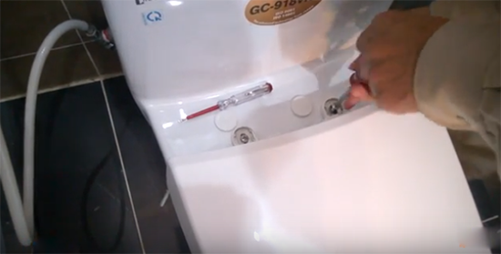 Nắp bồn cầu và bệ của nắp bồn cầu đi liền với nhau nên bạn tháo rời cả hai bộ phận này. Dùng tua vít để tháo rời ốc vít gắn liền giữa nắp nhựa với bệ sứ (nếu ốc vít có rãnh). Nếu ốc vít không có rãnh thì dùng kìm để cạy ốc vít (bulong) để tách rời nắp và bệ nắp ra khỏi bệ sứ.