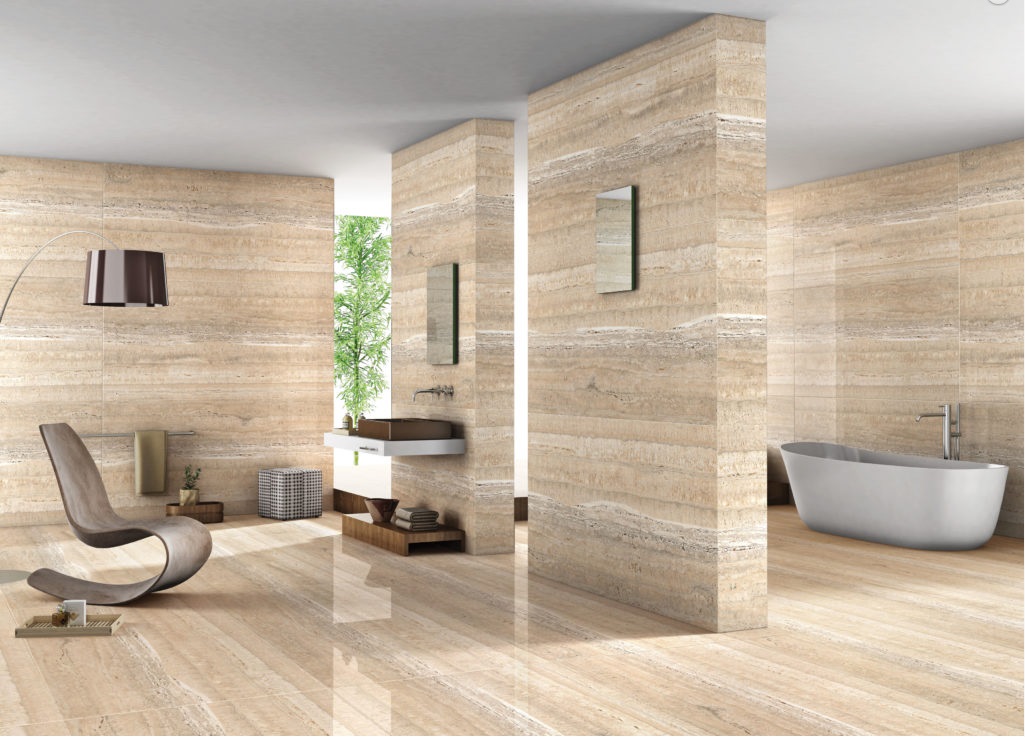 Khi mà gạch lát được sử dụng cho sàn nhà là chủ yếu thì nó cũng rất tuyệt để lát tường của phòng tắm. Tạo nên một cái nhìn đồng bộ bằng cách kết hợp gạch lát với sàn nhà, hoặc bạn có thể thêm vào sự đối lập bằng cách sử dụng những loại gạch có màu sắc hay những kiểu dáng khác nhau. Ví dụ, trong khi bạn dùng một loại gạch có màu vỏ trứng trong khu vực có vòi hoa sen thì những loại gạch có màu đất sét hay màu nâu sẫm có thể được sử dụng ở trên tường để tạo điểm nhấn. Bạn cũng có thể chọn để sử dụng loại màu sắc gạch lát từ một vùng của căn phòng đến việc sử dụng đường viền gạch ở một khu vực khác. Điều này có thể giúp bạn tạo nên sự pha trộn giữa các phong cách.