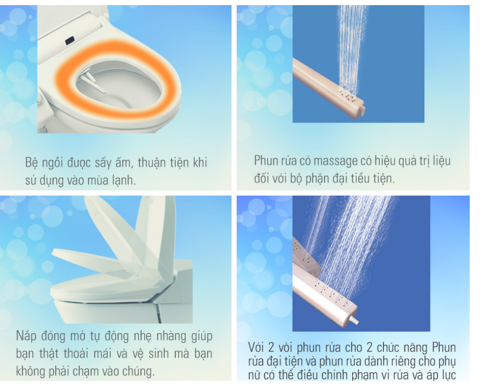 Bồn cầu điện tử được trang bị bảng điều khiển đa chức năng, cho phép người sử dụng đi vệ sinh luôn "sạch tay" với các chức năng cực kì hiện đại: tự động đóng mở, tự xả nước sau khi có người đi vệ sinh, hong khô bệ ngồi liên tục, phát tiếng nước chảy róc rách để át đi âm thanh tế nhị... đảm bảo an toàn vệ sinh tuyệt đối cho người sử dụng.