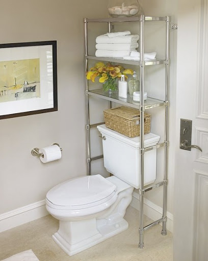 Có thể tận dụng không gian phía trên bồn cầu để gắn những chiếc kệ để khăn tắm, sữa tắm hoặc một bình hoa làm đẹp cho phòng tắm.