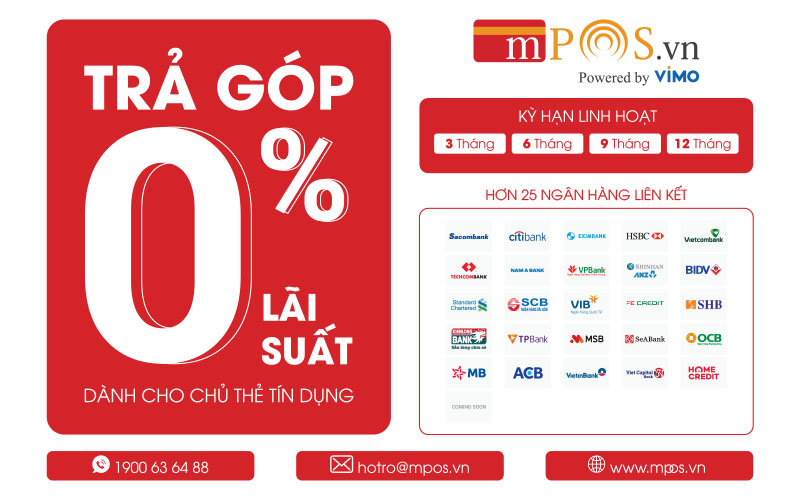 Mua trả góp hoàn toàn dễ dàng với thẻ tín dụng ATM hoặc Visa của ngân hàng bất kỳ có liên kế MPOS, không cần yêu cầu tài chính hay thủ tục giấy tờ rườm rà, không mất bất kỳ lãi suất nào hàng tháng siêu tiết kiệm và tiện lợi.