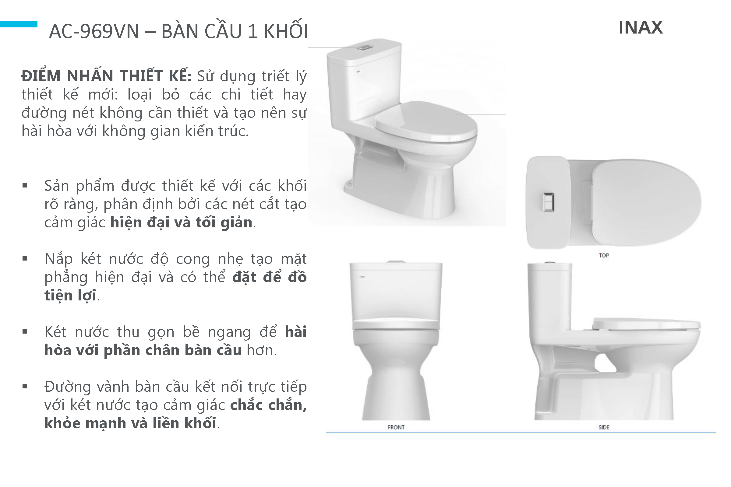 Bàn cầu một khối cao cấp giá thấp nhất, mới nhất năm 2019 của INAX ra đời nhằm đáp ứng nhu cầu cho khách hàng muốn có bàn cầu cao cấp, chất lượng mang thương hiệu Nhật Bản – Japan ngay trong ngôi nhà của mình. AC-969VN trở thành chiếc bồn cầu được bán chạy nhất hiện nay.
