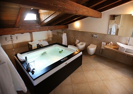5. Sự kết hợp giữa màu gỗ của tầng áp mái và tường gạch, sàn nhà nâu nhạt, gợi lên vẻ thoải mái, nhẹ nhàng nhưng không kém phần sang trọng cho phòng tắm dưới đây. Bồn tắm này được đặt dưới phần mái kinh giúp bạn có thể vừa ngâm mình trong làn nước, vừa ngắm nhìn bầu trời, tận hưởng thiên nhiên sau cả ngày làm việc vất vả.