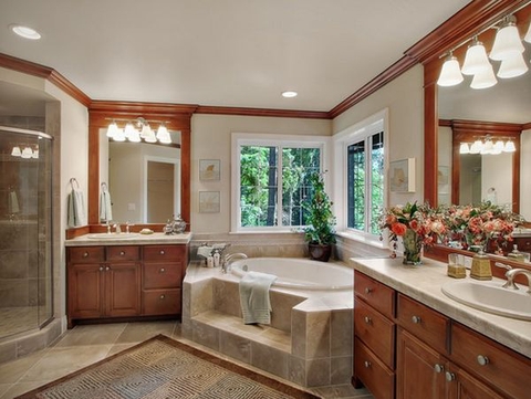 4. Phòng tắm này lại được thiết kế theo phong cách hiện đại và gần gũi. Bồn tắm hình bầu dục kết hợp với chất liệu đá cẩm thạch trắng sang trọng và sạch. Đồ nội thất gỗ cùng góc nhìn ra cửa sổ là không gian thư giãn mơ ước cho bất kì ai.