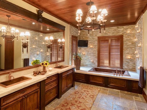 4. Vòi nước bằng đồng, bồn tắm gỗ, một tấm gương lớn trên tường để đảm bảo sự riêng tư cùng hệ thống đèn chùm khiến phòng tắm dưới đây phảng phất phong cách hoàng gia và cổ điển.
