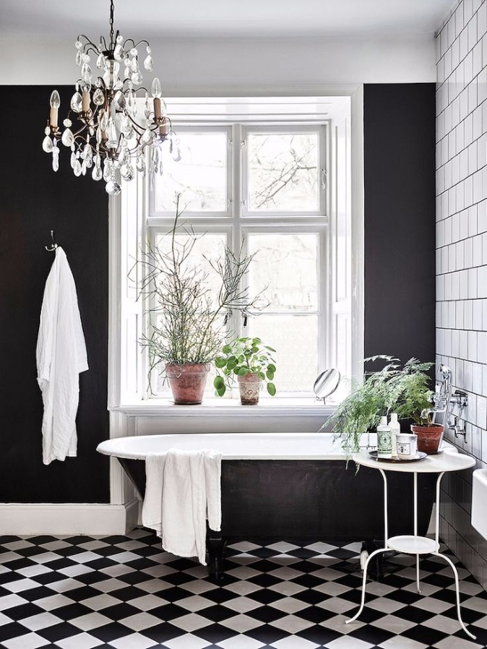 4. Sơn cửa, sơn cửa sổ phòng tắm với màu đen : nếu bạn không đủ can đảm để sơn những khu vực rộng lớn trong phòng tắm của bạn, thay vào đó, sơn đồ gỗ như của chính, cửa ra vào có thể là một cách an toàn và dễ dàng để giới thiệu một màu tối hơn. Hay với cửa sổ cũng vậy, cho dù bạn muốn giữ cho bức tường sáng màu hay tăng cường hiệu ứng đen trắng của tường tối và xử lý cửa sổ tối, cửa chớp đen chịu nước là một lựa chọn thiết thực và ưa nhìn cho phòng tắm.