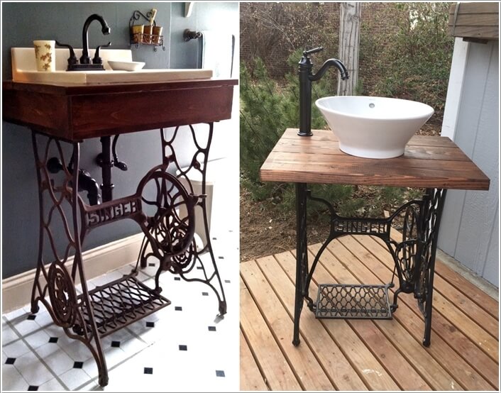 Một chiếc máy may cũ cũng làm nên nét nghệ thuật độc đáo với bồn rửa mặt đầy quyến rũ.