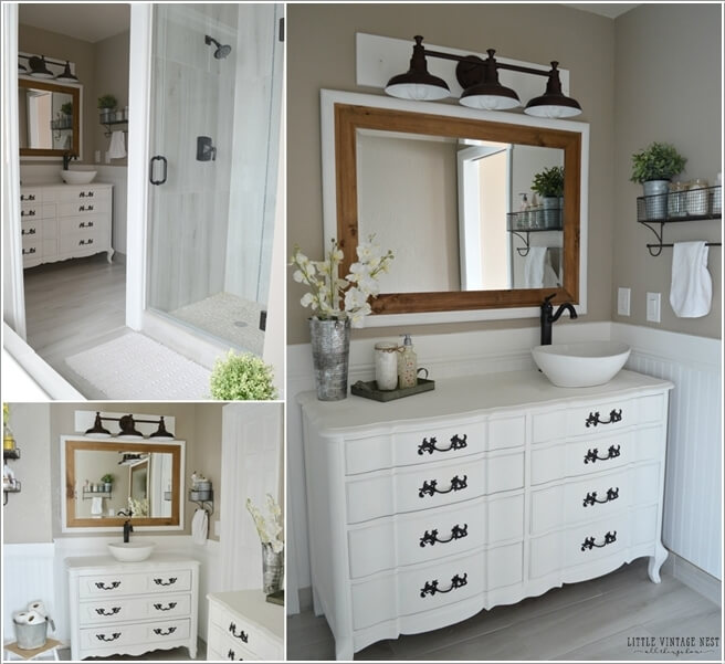Mộc mạc và đơn giản với tủ gỗ. Với cách làm sáng tạo thế này, bạn đã tiết kiệm được một khoản mà không cần chi phí cho việc mua bàn để đặt chậu rửa mặt rồi đấy. Nó cũng mang lại phong cách riêng cho phòng tắm của bạn.