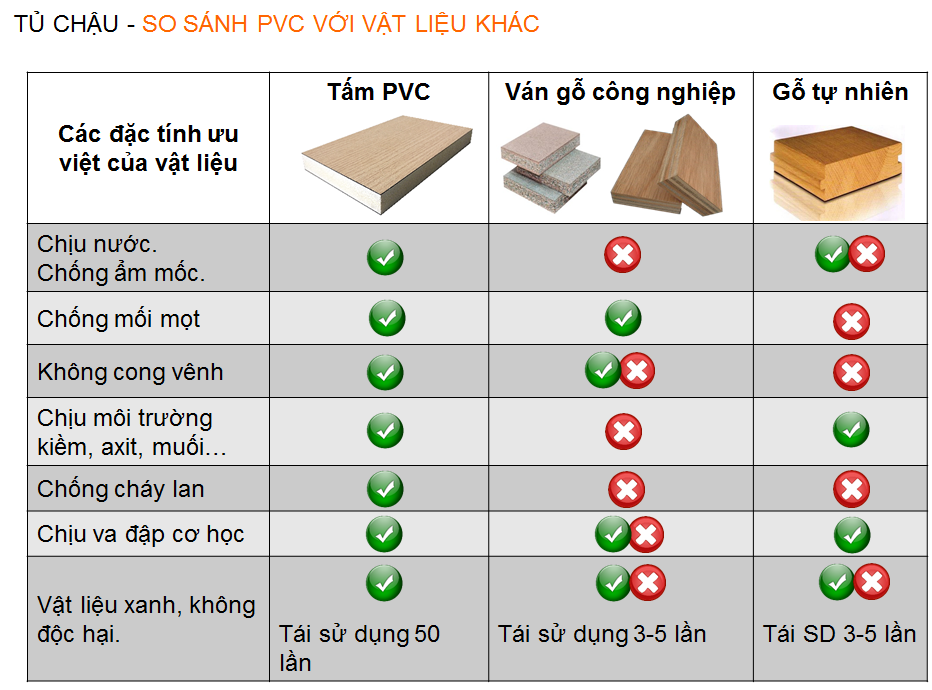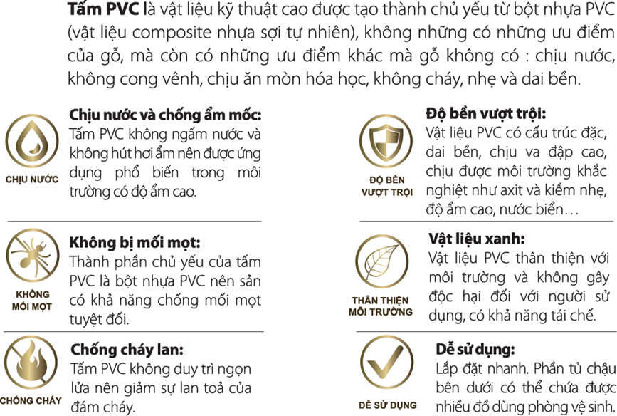 Tấm PVC là vật liệu kỹ thuật cao được tạo thành chủ yếu từ bột nhựa PVC (vật liệu composite nhựa sợi tự nhiên), không những có những ưu điểm của gỗ mà còn có những ưu điểm khác mà gỗ không có như: chịu nước, không cong vênh, chịu ăn mòn hóa học, không cháy, nhẹ, dai và bền.