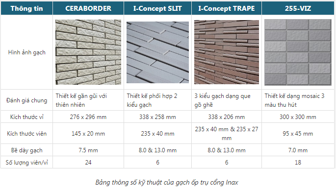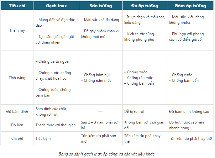 Khi sử dụng gạch Inax ốp cổng sẽ có nhiều ưu thế hơn các loại vật liệu khác. Bảng so sánh gạch kiến trúc Inax với các loại vật liệu ốp cổng khác dưới đây sẽ giúp bạn thấy được lợi thế này.